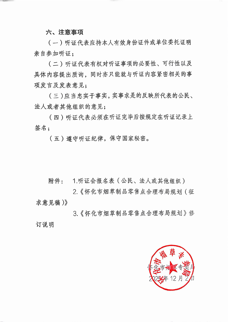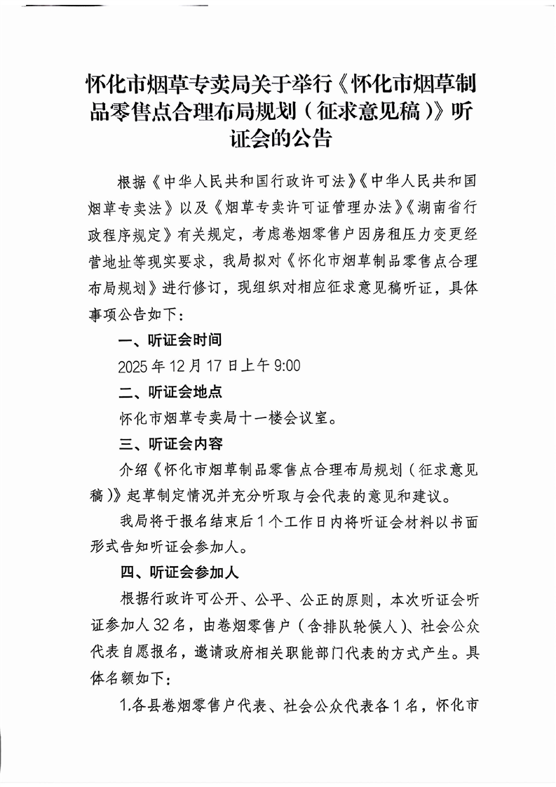 懷化市煙草專(zhuān)賣(mài)局關(guān)于舉行《懷化市煙草制品零售點(diǎn)合理布局規(guī)劃(征求意見(jiàn)稿)》聽(tīng)證會(huì)的公告